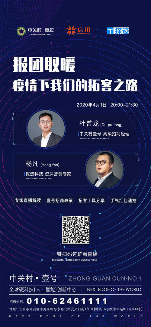 2020年4月1日20:00-21:00,中關村壹號將以"報團取暖-疫情下我們的拓客之路"為主題,通過在線直播的方式與業內人士以中關村壹號為主題共同探討產業園區招商的應對邏輯。