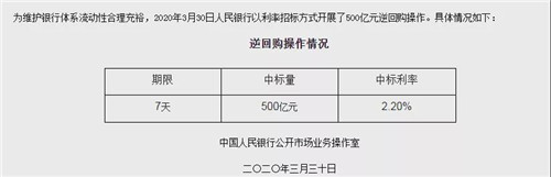 房訊網訊 3月30日,央行官網消息,為維護銀行體系流動性合理充裕,2020年3月30日中國人民銀行以利率招標方式開展了500億元7天期逆回購操作,中標利率為2.2%,較此前的2.4%下調20個基點。