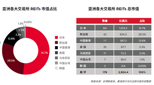 研究報告表明,截至2019年底亞洲市場上活躍的REITs共計178支,總市值達2,924億美元,同比增長約25%,其中日本、新加坡和中國香港三地REITs市值合計占比達93%。