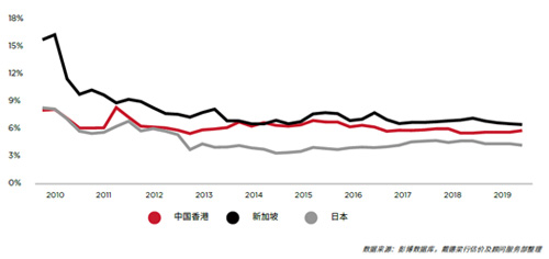 新加坡REITs市場分派收益率為6.2%,比中國香港高出0.6個百分點,而日本REITs市場的分派收益率最低,為4.0%。三地REITs市場的杠桿率均未超過45%,其中日本市場最高,達44%。2019年新加坡和日本REITs市場均實現了10年來最強勁的年度綜合收益,分別為25.3%和25.6%。得益于此,新加坡和日本REITs的市凈率較去年有較大提高。此外,香港REITs市場時隔6年再有房托基金上市,招商局商業房地產投資信托基金于2019年12月在港交所主板掛牌,集資金額逾30億港元。