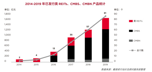 年國內商業不動產資產證券化市場延續了前一年快速發展勢頭,共發行81單產品,發行規模達1,550.8億元,產品數量和規模分別環比增長42.1%和36.3%,其中CMBS產品發行46單,發行規模1,035.1億元;類REITs產品發行23單產品,發行規模達393.6億元;CMBN產品發行12單,發行規模122.1億元。截至2019年底,國內商業不動產資產證券化產品已累計發行192單,共計持有底層物業423處,從物業類型上看,已發行產品涉及辦公、零售、綜合體、酒店、公寓、工業物流等資產類型。報告重點對類REITs、CMBS和CMBN產品在2019年的市場變化及亮點進行了分析,同時對截至2019年底已到期產品的處置方式進行了總結。