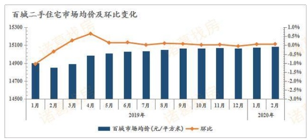 據諸葛找房數據顯示,2020年2月,100個重點城市二手住宅市場均價為15085元/平方米,環比微漲0.07%;與2019年2月相比,同比上漲1.09%,漲幅收窄0.06個百分點。整體上,2月份市場延續平穩運行趨勢,市場價格保持溫和波動。