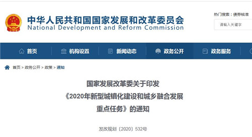 國家發展改革委關于印發《2020年新型城鎮化建設和城鄉融合發展重點任務》的通知