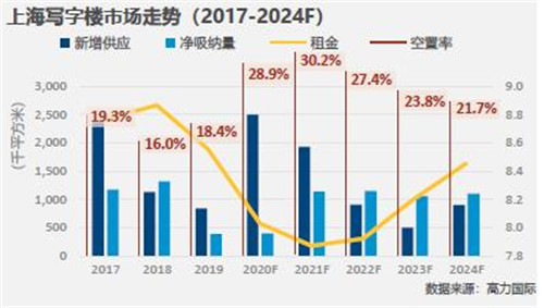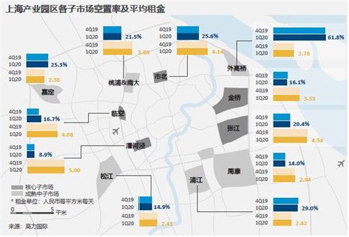 高力國際調研季報顯示,2020年第一季度上海寫字樓租賃市場凈吸納量整體處于低位。機構預判上海寫字樓空置率將從2019年的18.4%升至2020年的28.9%,2021年空置率將達30.2%的巔峰。