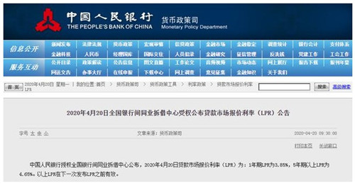 4月LPR報價出爐:1年期為3.85%,3月為4.05%