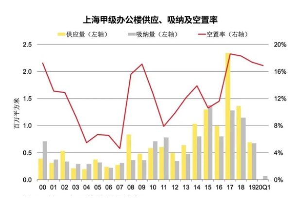 事實上,上海寫字樓市場整體空置率更甚于甲級市場。據(jù)高力國際最新統(tǒng)計,一季度上海寫字樓整體空置率為19.2%,環(huán)比下降0.8個百分點,但這一空置率將在2020年末達到28.9%。