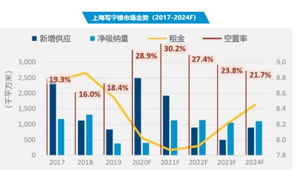 據(jù)第一太平戴維斯數(shù)據(jù),一季度上海甲級寫字樓租金環(huán)比加速下跌1.0%至7.8元/平方米·天。同時,高力國際數(shù)據(jù)顯示,2020年全年上海寫字樓整體租金將下降6%,并且在一段時間內(nèi)維持低位,2022年才望回復上漲。