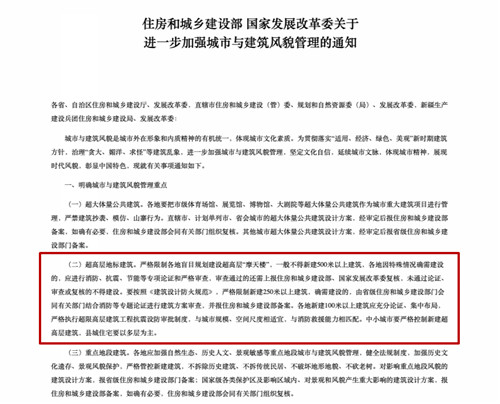 直至今年4月27日,住建部、國(guó)家發(fā)改委發(fā)布通知,對(duì)新建500米以上、250米以上及100米以上建筑進(jìn)行了規(guī)范。通知稱,在超高層地標(biāo)建筑方面,要嚴(yán)格限制各地盲目規(guī)劃建設(shè)超高層“摩天樓”,一般不得新建500米以上建筑,各地因特殊情況確需建設(shè)的,應(yīng)進(jìn)行消防、抗震、節(jié)能等專項(xiàng)論證和嚴(yán)格審查,審查通過(guò)的還需上報(bào)住房和城鄉(xiāng)建設(shè)部、國(guó)家發(fā)展改革委復(fù)核,未通過(guò)論證、審查或復(fù)核的不得建設(shè)。
