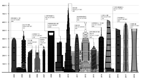 從2003年起全球范圍內(nèi)每年最高的竣工建筑。來(lái)源:《2018年高層建筑回顧報(bào)告》