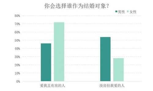 “你愛的人沒有房,愛你的人有房”,你將會選擇誰作為結(jié)婚對象?調(diào)查數(shù)據(jù)顯示,男性選擇“沒房但我愛的人”較高,占比達(dá)54%;女性選擇“愛我且有房”的比例高達(dá)72%。相比之下,女性在現(xiàn)實(shí)面前表現(xiàn)得更加“物質(zhì)”一些,不僅會看中“有房”這一關(guān)鍵性要素,而且也很明確地選擇“愛我的人”,而非“我愛的人”,這也許是追尋真正所愛之人太難了。