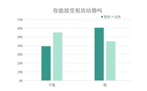 貝殼研究院調(diào)研數(shù)據(jù)顯示,“租房結(jié)婚”和“無房不婚”是當(dāng)下社會較為普遍存在的兩種婚姻觀念,占比幾乎持平。但是分性別來看,男女性對租房結(jié)婚接受與否的態(tài)度大不同,60.6%的男性能夠接受租房結(jié)婚,而只有44.9%的女性愿意租房結(jié)婚。