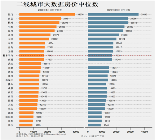 二線城市房價中位數的平均值為17342元/建筑平方米,比上月漲跌303元/建筑平方米。