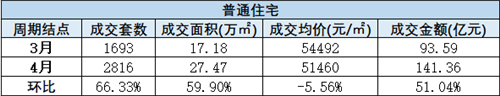 4月,北京普宅成交額141.3億元,環(huán)比上月上漲51.04%。單月普宅成交2816套,環(huán)比上月上升66.33%,連續(xù)兩月實現(xiàn)較大幅度增長;在銷售均價方面,普宅單月銷售均價51460元/平米,環(huán)比上月小幅降低5.56%,長期來看保持穩(wěn)定。