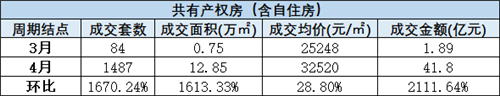 4月,隨著幾個共有產(chǎn)權(quán)房項目網(wǎng)申的開始,共產(chǎn)房成交情況喜人,成交套數(shù)、成交金額雙雙劇增:成交套數(shù)激增1670.24%至1487套;成交金額激增2111.64%達41.8億。