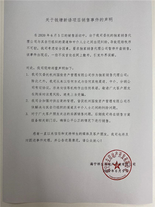 對(duì)此,祥生地產(chǎn)旗下海寧祥生房地產(chǎn)開(kāi)發(fā)有限公司(以下簡(jiǎn)稱“海寧祥生”)發(fā)布聲明稱,在6月5日的銷售活動(dòng)中,由于公司委托的獨(dú)家銷售代理公司與其自行組織的渠道和中介人士之間出現(xiàn)糾紛,導(dǎo)致現(xiàn)場(chǎng)秩序不可控,公司考慮安全因素,要求獨(dú)家銷售代理公司暫停開(kāi)盤銷售。