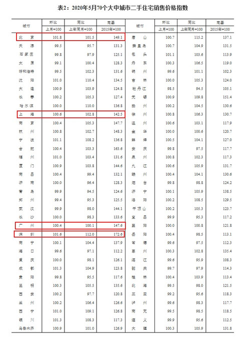 2020年5月70個大中城市二手住宅銷售價格指數。來源:國家統計局網站