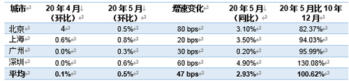 全國70個大中城市新建住宅價格指數在4月份出現反彈后,5月份延續了上漲趨勢。全國迎來了近十個月以來均價上漲城市數量最多的一個月,平均售價在5月環比上漲0.49%。其中四個一線城市錄得了顯著上漲:北京變化幅度最大,由4月的環比下降到5月環比上漲0.5%;上海則錄得一線城市單月最大漲幅,5月環比上漲0.8%。