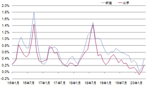 圖4:一、二線城市新建商品住宅銷售價格指數,2020年5月