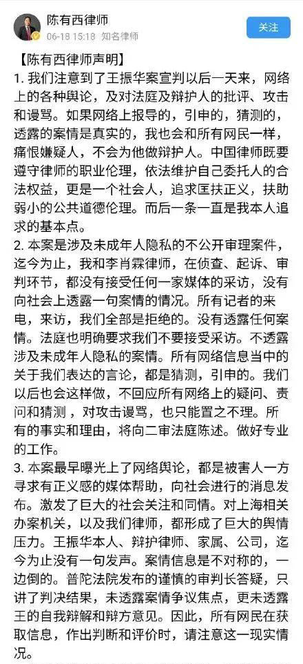 6月18日,王振華辯護律師陳有西在社交平臺發布聲明表示,王振華已經明確提起上訴,請求二審判決他無罪。