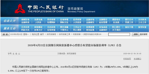 房訊網訊 6月22日,中國人民銀行授權全國銀行間同業拆借中心公布,2020年6月22日貸款市場報價利率(LPR)為:1年期LPR為3.85%,5年期以上LPR為4.65%。以上LPR在下一次發布LPR之前有效。
