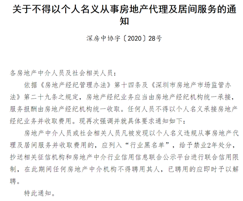 6月23日,深房中協(xié)發(fā)布《關(guān)于不得以個(gè)人名義從事房地產(chǎn)代理及居間服務(wù)的通知》(以下簡(jiǎn)稱《通知》)。《通知》表示,房地產(chǎn)經(jīng)紀(jì)業(yè)務(wù)應(yīng)當(dāng)由房地產(chǎn)經(jīng)紀(jì)機(jī)構(gòu)統(tǒng)一承接,服務(wù)報(bào)酬由房地產(chǎn)經(jīng)紀(jì)機(jī)構(gòu)統(tǒng)一收取。任何人員不得以個(gè)人名義承接房地產(chǎn)經(jīng)紀(jì)業(yè)務(wù)并收取費(fèi)用。