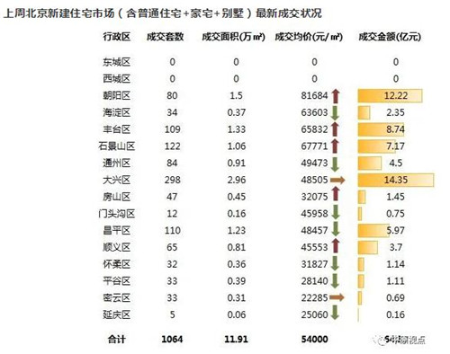 房訊網訊 根據北京中原的統計數據,上周北京新建住宅市場成交64.32億元,與前一周幾乎持平,創下今年成交額周度第三位。成交1064套,環比前一周減少86套,其中排名前20樓盤中,非限競房占據主力。最新新房成交均價為54000元/平方米,價格環比上揚。