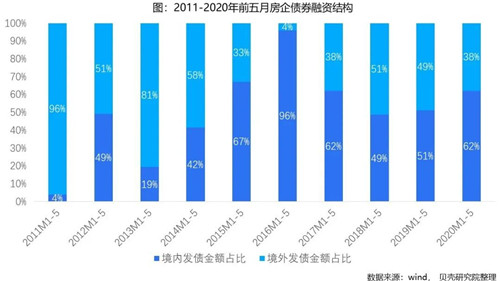 境內債券持續火熱,而境外債券在3月份跳水后,經過一個多月的沉寂后也逐漸升溫。5月份以來,陸陸續續有多家房企開始在境外發債。貝殼數據顯示,5月單月,國內外債券融資總額發行約617億元,同比上升31%;今年前5個月房企境內外債券融資累計約5627億元。