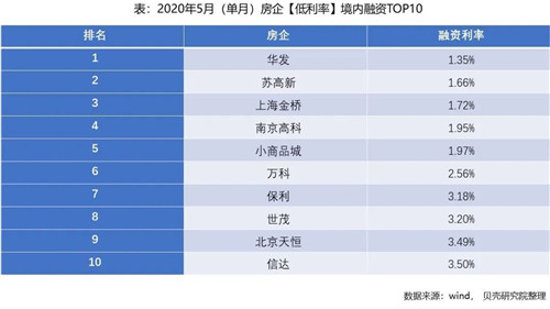 6月3日,珠海華發集團成功發行2020年度第十三期超短期融資券,實際發行金額10億元,票面利率僅1.35%。另如蘇高新、上海金橋、南京高科等房企,在5月份的融資成本均低于2%。