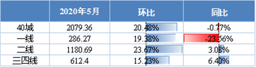 根據(jù)諸葛找房數(shù)據(jù)顯示,2020年5月一線、二線、三四線城市新房銷售面積環(huán)比分別上漲19.38%、23.67%、15.23%;一線城市同比依然下跌,跌幅為23.56%,二線和三四線城市則分別同比上漲3.08%和6.40%。受疫情影響積壓的購房需求近3個月迎來迅速釋放。