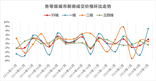 從價格上來看,5月份重點監(jiān)測的35城成交均價同環(huán)比均上漲,分城市等級中僅三四線城市環(huán)比下跌,其余等級城市均是同環(huán)比上漲。