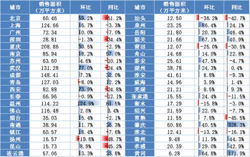 從具體城市來看,監(jiān)測的重點40城中32城銷售面積環(huán)比上漲,延續(xù)前期熱度,但同比僅18城上漲。