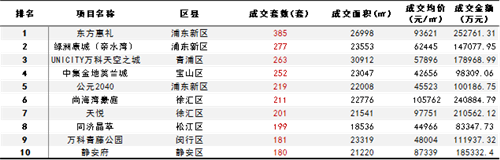 諸葛找房重點城市樓盤監(jiān)測數(shù)據(jù)顯示,5月份上海成交主要集中于浦東新區(qū)、徐匯區(qū)等區(qū)域。5月,東方惠禮項目位居成交套數(shù)榜首,單月成交385套,成交面積26998平方米,成交均價93621元/平方米;其次為同區(qū)的綠洲康城(親水灣)項目,成交277套,成交面積23553平方米,成交均價62445元/平方米;青浦區(qū)的UNICITY萬科天空之城項目成交263套,位居第三,該項目成交均價57896元/平方米;位于寶山區(qū)的中集金地美蘭城項目成交252套,成交面積23047平方米,成交均價顯示為42656元/平方米。