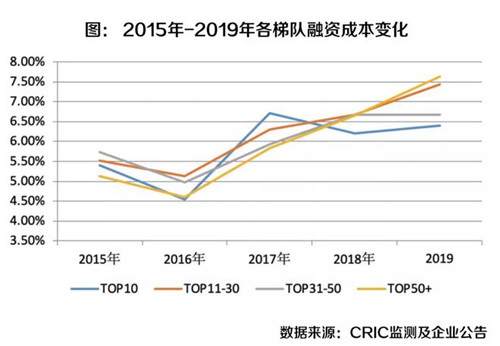 2019年CRIC監測的80家房企來看,平均融資成本達7.47%,為近五年最高。值得注意的是銷售50強以后的房企融資成本上升速度非常快,顯著高于行業平均,由此可以預見,業績銷售排名更低的小企業融資壓力更是巨大。