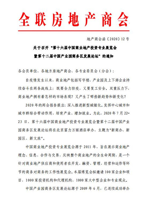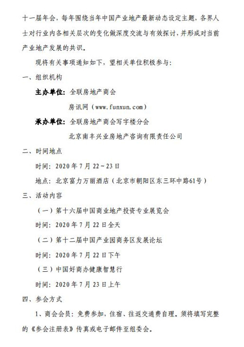 房訊網訊 近日,全聯房地產商會發布通知,宣布第十六屆中國商業地產投資專業展覽會暨第十二屆中國產業園商務區發展論壇將在北京富力萬麗酒店舉辦,時間為2020年7月22-23日,主題為“新商辦、新園區、新文旅”。