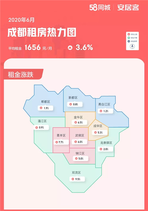 新一線城市中,成都6月份新增房源量整體出現27.2%的環比增幅,錦江、青羊出現40%以上的環比漲幅。相對于新增房源量的上漲行情不同的是,成都租房熱度出現2.5%的環比小幅下滑。