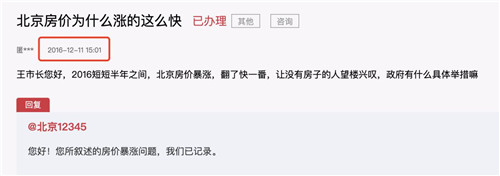 2016年底,一位北京市民在領導留言板上留言,抱怨半年之內“房價暴漲,翻了快一番”。12345還給了回復,表示“已記錄”。