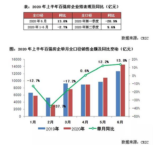 2020年6月,市場熱度持續、房企去化加速,TOP100房企單月實現全口徑銷售金額14517.2億元,環比增長33%。單月業績同比逐月回升,自4月轉正后進一步提升至13.8%。