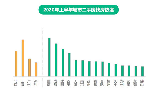 疫情影響下,不同城市級別的二手房找房熱度也有所不同。58安居客房產研究院監測結果顯示,2020年上半年,一線城市中,北上深二手房訪問熱度同比漲幅均超過10%。其中,上海的二手房找房熱度領先,其次為北京。新一線城市中,重慶、成都、沈陽二手房訪問熱度排在前三。成都、長沙、東莞二手房訪問熱度同比漲幅超過一成。這些城市不僅經濟增長速度快,美食美景和舒適的生活氛圍也得到許多年輕人的青睞。
