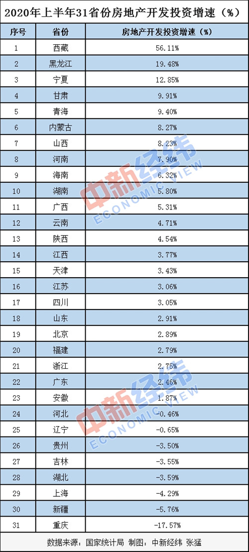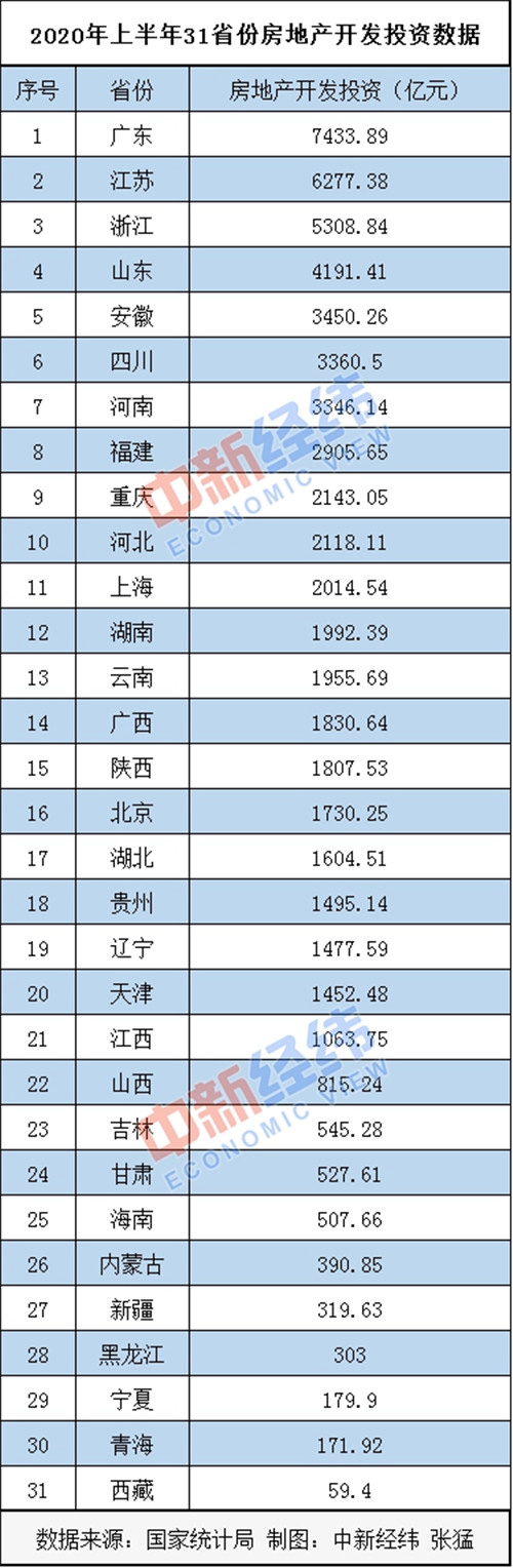 日前,國家統計局公布了31省份2020年上半年房地產開發投資數據。