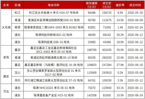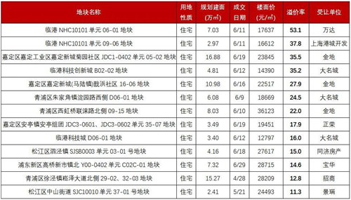 從溢價率來看,上半年,溢價率最高的地塊為閔行區(qū)浦錦街道蘆恒路北塊居住小區(qū)3-8地塊,溢價率164%,競得人為上海閔行儲備糧管理總公司。商品住宅用地中,溢價率最高的為臨港NHC10101單元06-01地塊,溢價率為53.13%,競得人為萬達。