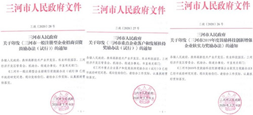 為了提升區(qū)域內(nèi)企業(yè)軟實力,扶持企業(yè)的創(chuàng)新進步,鼓勵獎勵一般企業(yè)和重點企業(yè)的落戶和發(fā)展,5月9日,三河市又分別印發(fā)了《三河市2019年度鼓勵科技創(chuàng)新增強企業(yè)軟實力獎勵辦法》、《三河市重點企業(yè)落戶和發(fā)展扶持獎勵辦法(試行)》、《三河市一般注冊型企業(yè)招商引資鼓勵辦法(試行)》,引導產(chǎn)業(yè)和創(chuàng)新資源聚集,壯大區(qū)域經(jīng)濟總量和綜合實力。