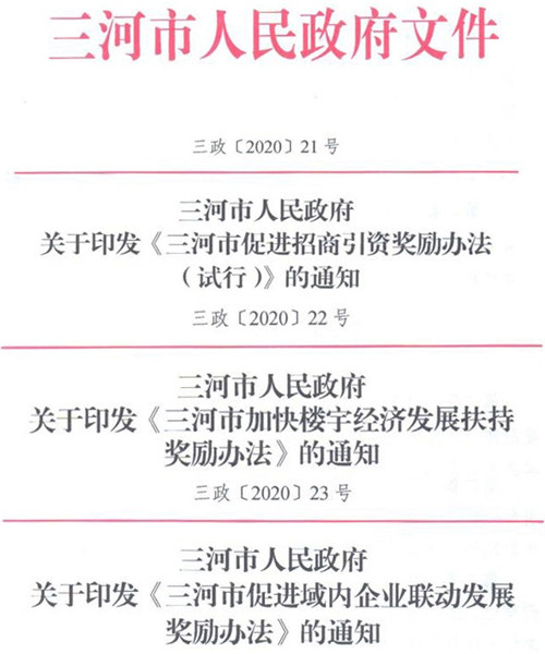 房訊網(wǎng)訊 出臺《三河市促進招商引資獎勵辦法(試行)》,打造全方位、多層次寬領(lǐng)域的招商引資新格局;加快樓宇經(jīng)濟發(fā)展,提升樓宇經(jīng)濟產(chǎn)業(yè)能級和集聚效應;促進企業(yè)聯(lián)動,鼓勵科技創(chuàng)新,促進實體企業(yè)提質(zhì)增效……