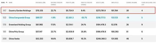 聚焦房地產行業,共有5家企業上榜。其中,排名前三的房企為碧桂園控股有限公司、中國恒大公司和綠地控股集團有限公司,排名分別為第147名、152名和176名。另外兩家企業為中國保利集團和萬科企業股份有限公司,分別位列第191名和208名。