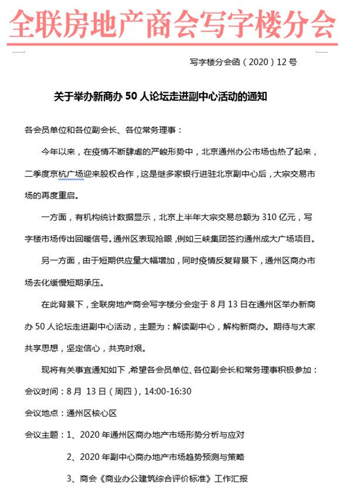 "新商辦50人論壇走進副中心"活動由全聯房地產商會寫字樓分會主辦,北京國際財富中心協辦,房訊網聯合選址通共同承辦;顒拥玫搅送ㄖ輩^投資促進服務中心、國際五大行以及知名代理機構、經紀公司的支持,各會員單位、副會長和常務理事廣泛參加,截止目前,萬科、保利發展、中國金茂、大悅城控股、金融街、遠洋集團、金地商置、藍光文商旅、鴻坤產業等品牌房企優質項目的負責人均已報名參與。