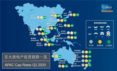 進入第二季度,COVID-19在亞太部分地區(qū)得到初步控制,商業(yè)活力較第一季度有所回升。但綜合而言,亞太商業(yè)物業(yè)市場的表現(xiàn)及發(fā)展情況與往年同期相比仍較為滯緩,過半數亞太城市/地區(qū)市場的資本化率繼續(xù)上升,環(huán)比上升幅度在0.25%至0.5%。