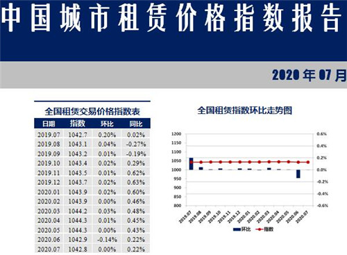 由易居企業(yè)集團(tuán)、上海易居房地產(chǎn)研究院中國房地產(chǎn)測(cè)評(píng)中心、華東師范大學(xué)東方房地產(chǎn)研究院三方共同發(fā)布的《2020年7月中國城市住房租賃價(jià)格指數(shù)報(bào)告》顯示,7月份中國城市租賃價(jià)格指數(shù)為1042.8點(diǎn),較上月下降0.1點(diǎn),與上月基本持平,同比漲幅0.22%。從走勢(shì)來看,該指數(shù)在經(jīng)歷了18個(gè)月上漲后,連續(xù)出現(xiàn)兩個(gè)月下跌的態(tài)勢(shì)。