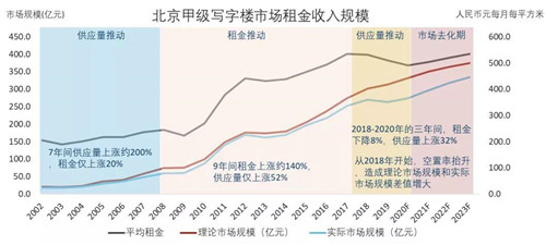 縱觀北京甲級(jí)寫字樓市場(chǎng)發(fā)展的歷史,整體租金收入規(guī)模從2002年的大約30億元左右,增長(zhǎng)到2019年的大約420億元,18年間增長(zhǎng)大概14倍,預(yù)計(jì)到2023年整體理論市場(chǎng)規(guī)模將達(dá)到500億元。