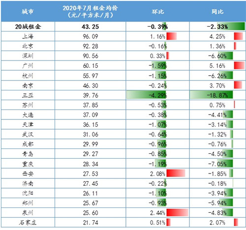數(shù)據(jù)顯示,7月,一線城市月平均租金為每平方米92.98元,環(huán)比上升0.45%,同比下降0.44%;重點二線城市為34.47元,環(huán)比下跌0.78%,同比下跌3.19%。一線城市租金水平在連續(xù)下降3個月后止跌轉漲,環(huán)比上漲0.45%;二線重點城市租金繼續(xù)下滑,相比上月跌幅擴大0.32個百分點。