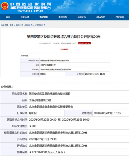 好消息有時會遲到,但不負所期。6-7月,中國政府采購網等多個相關招標網站發布了關于第四使館區相關工作的公開招標公告,涉及使館區邊界圍墻、電氣工程、綠化工程、土建工程等,開啟了備受矚目的北京第四使館區建設序章。