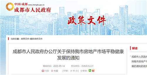 房訊網訊 9月14日,成都市人民政府辦公廳發布《成都市人民政府辦公廳關于保持我市房地產市場平穩健康發展的通知》。